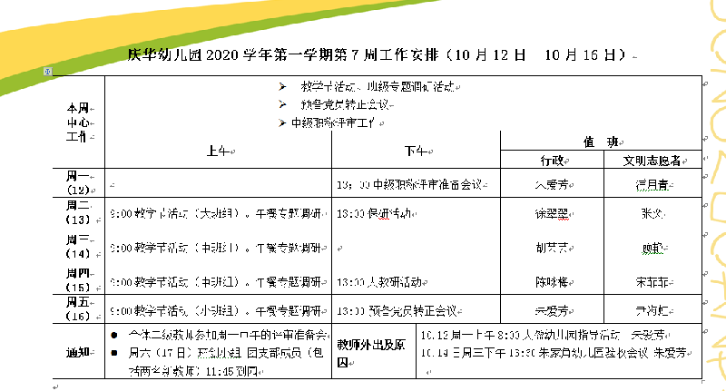2020学年第一学期第7周工作安排(10月12日--10月16日)